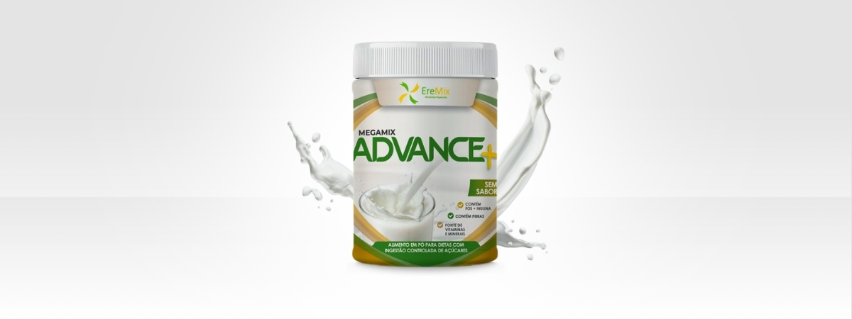 Megamix Advance+ é um alimento em pó para dieta com ingestão controlada de açúcares, especialmente formulado para oferecer nutrientes, vitaminas, minerais, proteínas e fibras alimentares. Sua formulação é hiperprotéica com um mix de proteínas lácteas de alto valor biológico, fibras solúveis de FOS e inulina. Não contém glúten. Não contém sacarose. Contém lactose.